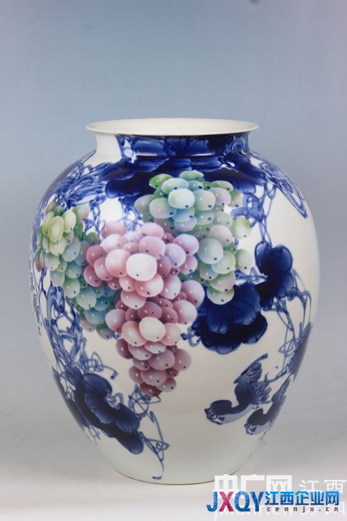 吴志辉的光影青花有国画的构图笔墨和神韵,一点一画一筋一叶,写意中透露的是他的水墨修养。同时,运用了西画黑白灰的对比,使得造型虚实相生、立体鲜活,通过精心布局和青花喷花的深浅浓淡变化,他描绘出的景物呈现着强烈的空间感,光影生动、形态逼真。尤其是他笔下的葡萄,重重叠叠间晶莹剔透,水润诱人。